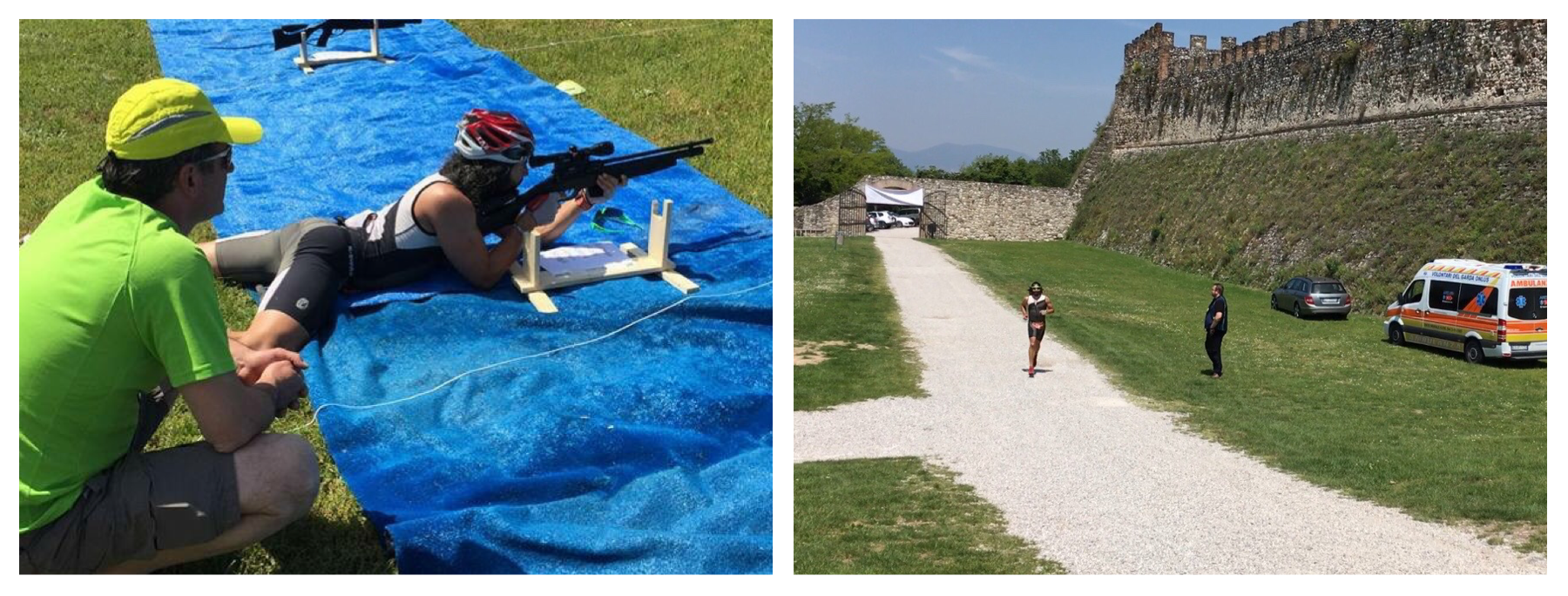 Terminato il percorso a forma di rettangolo, circunavigando le due boe sul lato opposto della riva ad attenderci la prima fase di transizione. Indossate le scarpe velocemente si è subito via per percorrere i verdissimi 8 chilometri di trailrunning tra bosco e campi di ulivi, percorso ondulato e a tratti con salite impegnative, specialmente nel finale, dove tra radici e sterrato ci si trova a correre nei pressi della Rocca di Lonato tra pietre e storia.Li ad attenderci, una bellissima vista sulla valle a lenire le fatiche della seconda prova, ma con pochissimo tempo a disposizione, infatti appena raggiunto il suggestivo centro storico ci troviamo ai piedi di un’erta salita che ti spezza il fiato e poi il tanto sospirato rettilineo in leggera salita e l’ingresso nel primo anello delle mura della Rocca. Ecco la T2 situata su un verde prato, proprio a ridosso delle alte mura interne, pochi secondi per poi ripartire a razzo in sella alla mountainbike. Bellissima l’uscita attraverso una piccola porticina aperta che varca le mura. Anche qui un percorso ondulato e veloce in grado di alternare tratti di discese tecniche e sconnesse a strappi ripidi in salita, ma sempre pedalabile e divertente. I chilometri totali sono circa 20 ma superata la metà, il percorso si snoda su sentieri interni ai limitrofi boschi del poligono di tiro che ospiterà l’inusuale prova di tiro con la carabina in perfetto biathlon style.